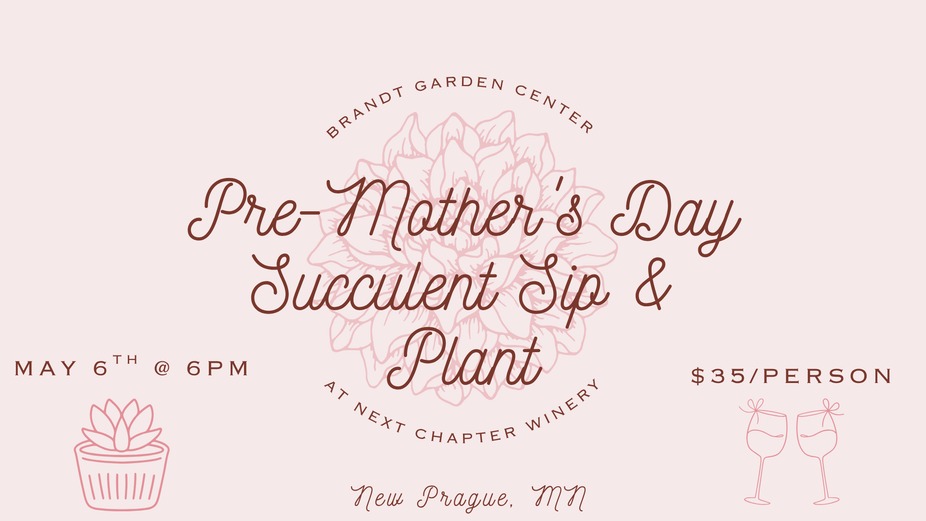 Join Brandt Gardens & Greenhouse on May 6th, 6PM at Next Chapter Winery for a fun and creative succulent & cactus planting experience—perfect for treating yourself, celebrating with Mom, or creating a handmade gift she’ll love. With easy, step-by-step guidance, you’ll be led through designing a beautiful custom arrangement—great for beginners and plant lovers alike. Brandt Gardens will provide a wide variety of containers ranging from vintage to modern, along with a gorgeous selection of succulents and cacti to choose from. All planting supplies are included, so you can simply relax, sip, and create. Cost: $35 per person https://nextchapterwinery.com/new-prague-next-chapter-winery-events Your ticket includes: Choice of container Choice of succulents or cacti All soil, tools, and supplies needed (Additional upgrades or specialty items may be available for an added fee.) Brandt Gardens and Greenhouse will also bring a variety of containers that can be purchased separately for a special gift for the mom in your life (hanging baskets, planters with flowers, and other selections to choose from). 🍷 Make it a night out! Next Chapter Winery will be serving wine, cocktails, beer, and non-alcoholic options—so grab a drink, unwind, and enjoy a memorable evening before Mother’s Day. More info or special requests: www.brandtgardens.com or brandtgardens@gmail.com