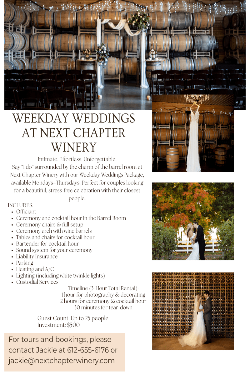 Interested in a wedding tour? Please contact Jackie at 612-655-6176 or nextchapterwinery@gmail.com